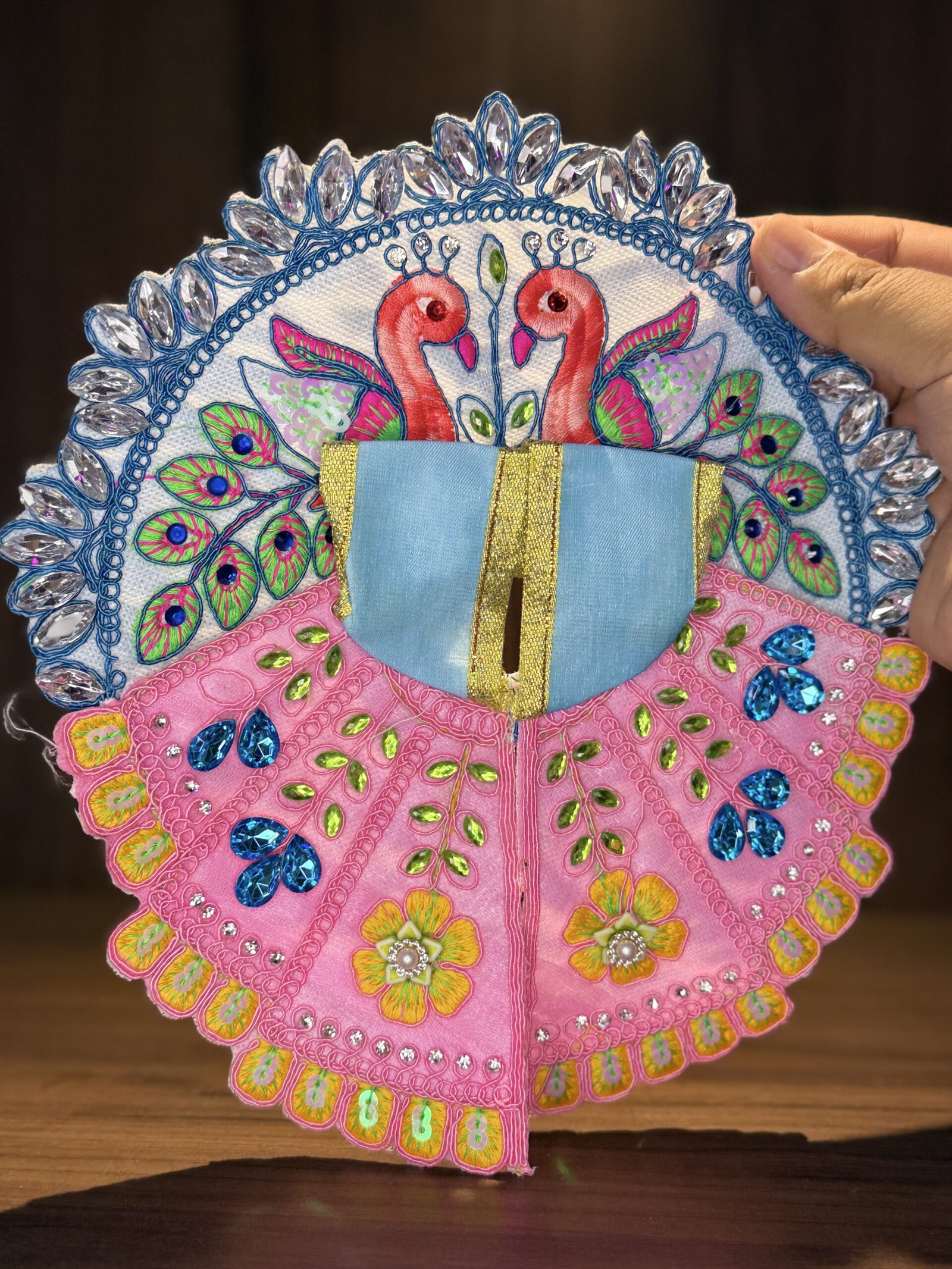A graceful blend of white and pink, this unique dress features red-hued peacocks with blue gemstone highlights. Yellow floral embroidery and sparkling beadwork make it a standout piece for traditional worship and divine celebrations.