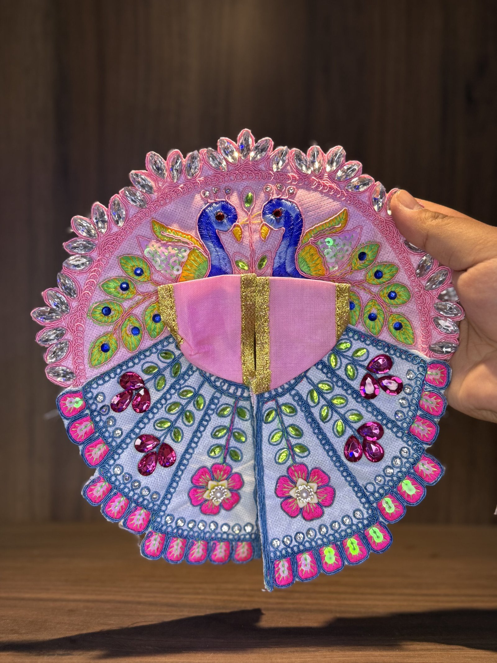 This charming combination of soft pink and sky blue is designed with elegance in mind. Pink gemstones, floral embroidery, and detailed peacock motifs make this poshak ideal for festive decor and devotional ceremonies.