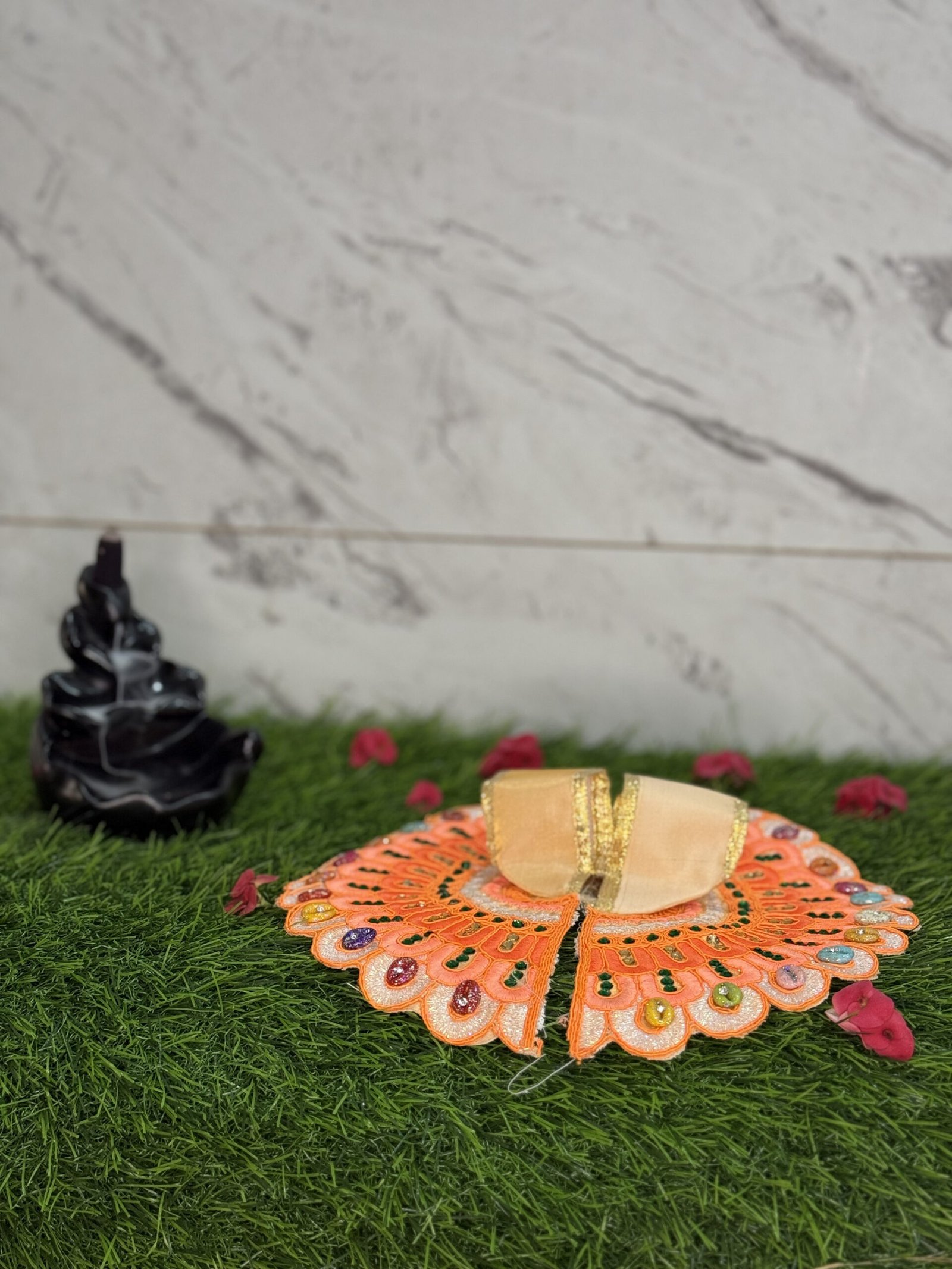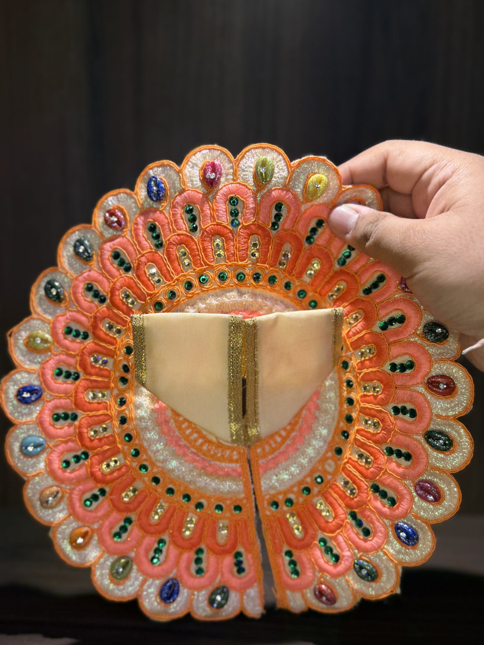 Elegant in soft peach-orange hues, this outfit combines gentle cream fabric with sparkling green beadwork and radiant stones in a peacock-feather arrangement. A unique blend of vibrancy and grace, suitable for everyday darshan or temple offerings.