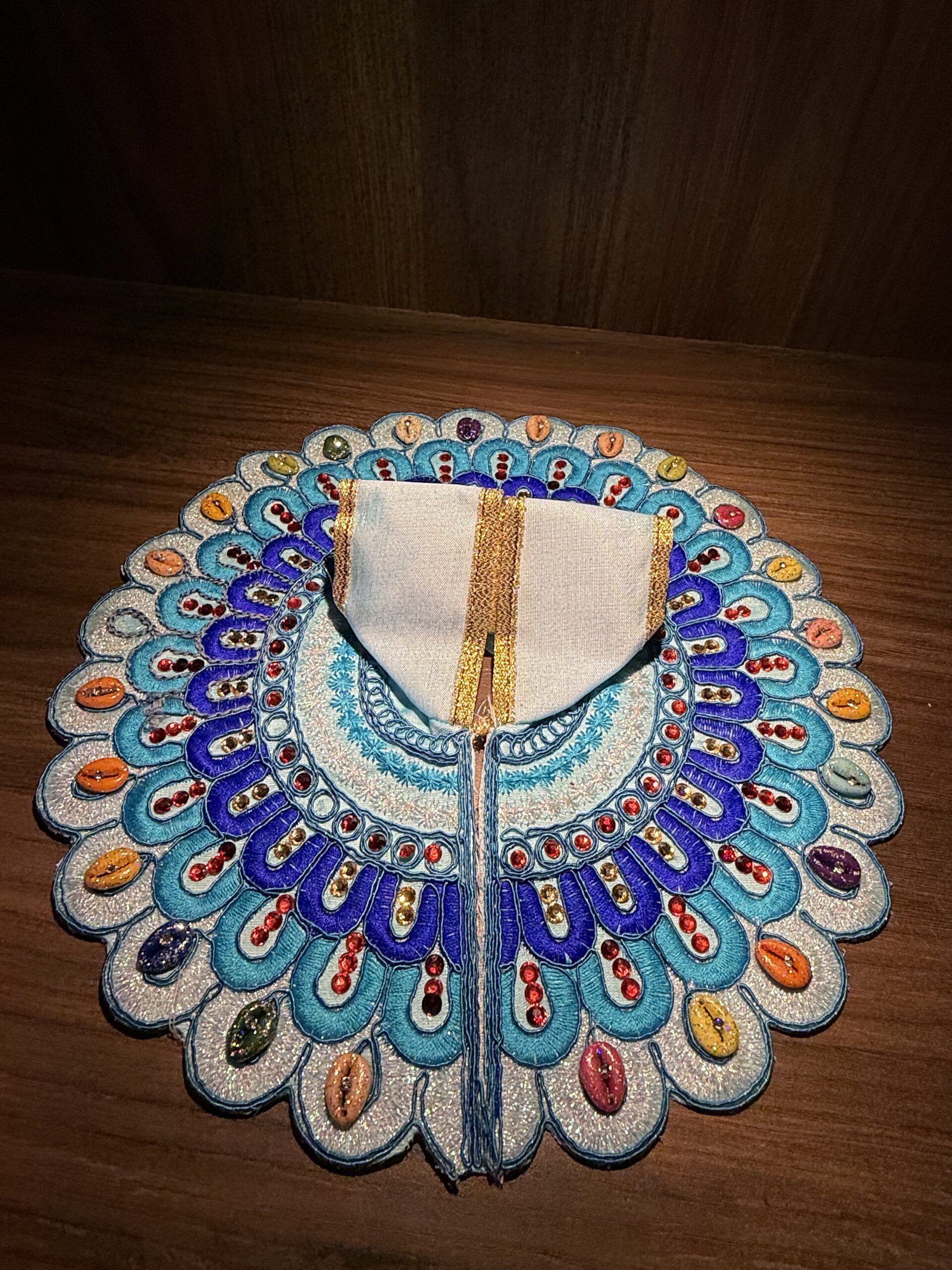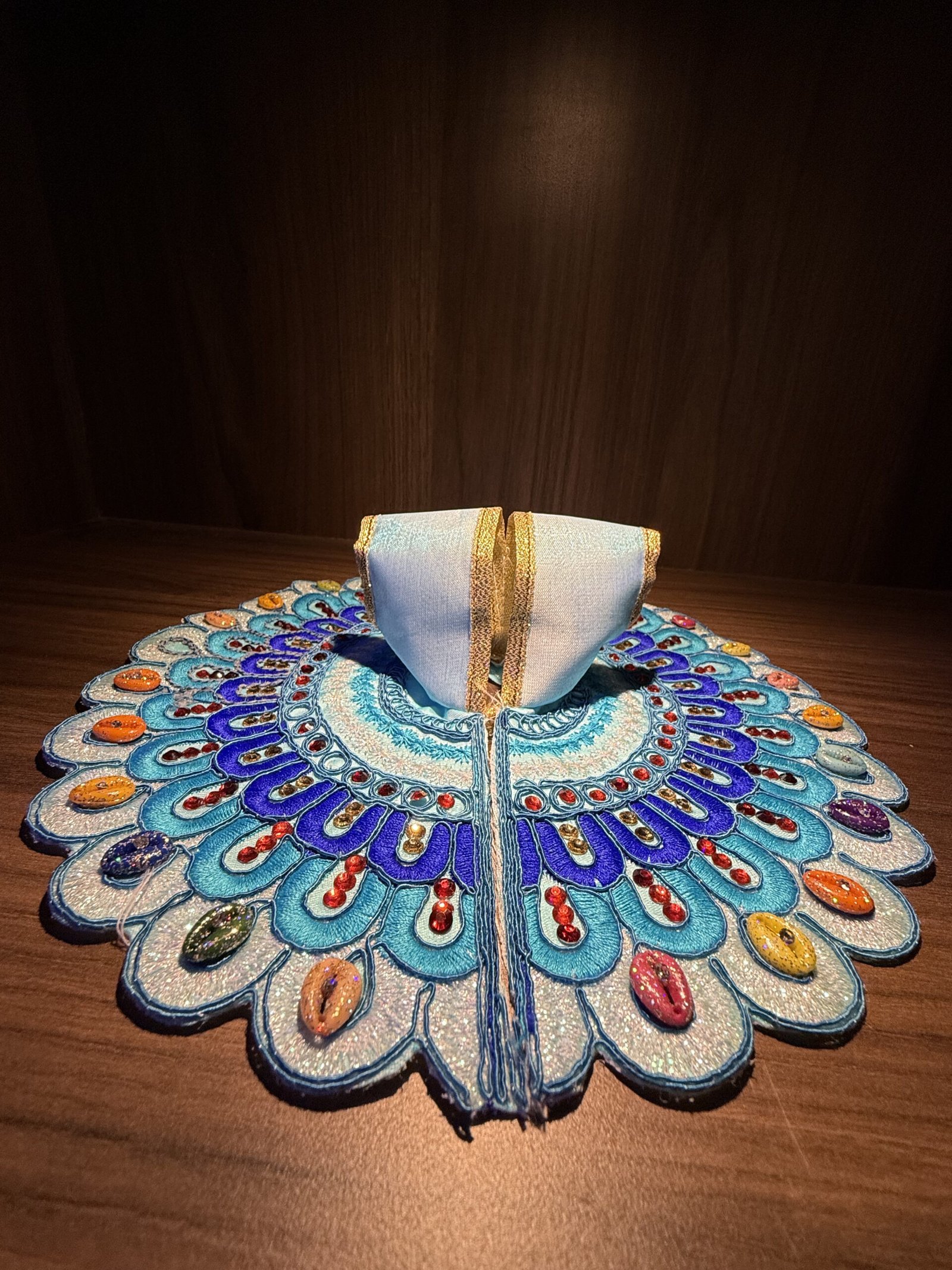 Bring a touch of serenity to your Laddu Gopal’s look with this sky blue dress, decorated with deep blue embroidery, multicolor stones, and sparkling red beads. Its peacock-inspired pattern adds a graceful charm, perfect for devotional events.