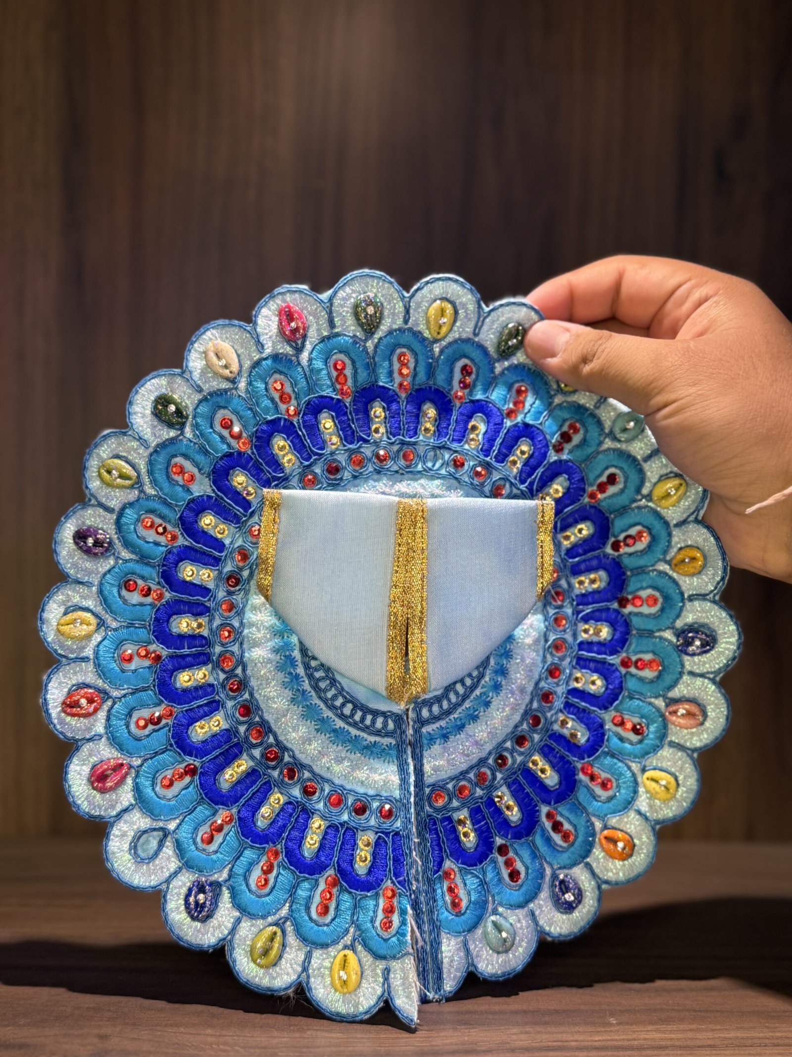 + Free ShippingBring a touch of serenity to your Laddu Gopal’s look with this sky blue dress, decorated with deep blue embroidery, multicolor stones, and sparkling red beads. Its peacock-inspired pattern adds a graceful charm, perfect for devotional events.