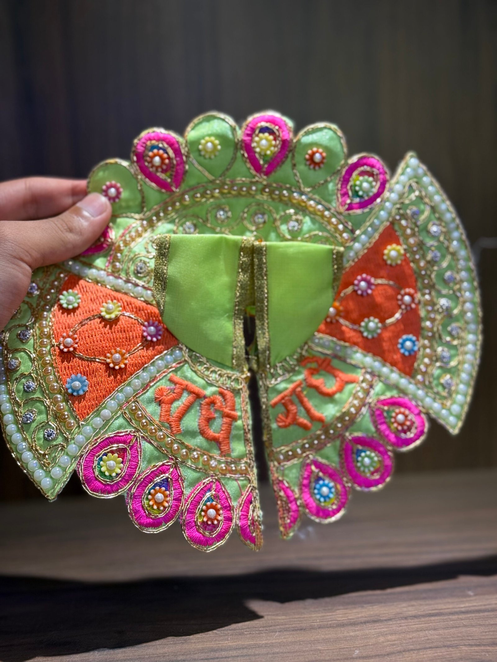 This glowing yellow dress with floral borders and decorative stonework adds brightness to your Laddu Gopal’s wardrobe. “Radhe Radhe” embroidery enhances its devotional beauty.