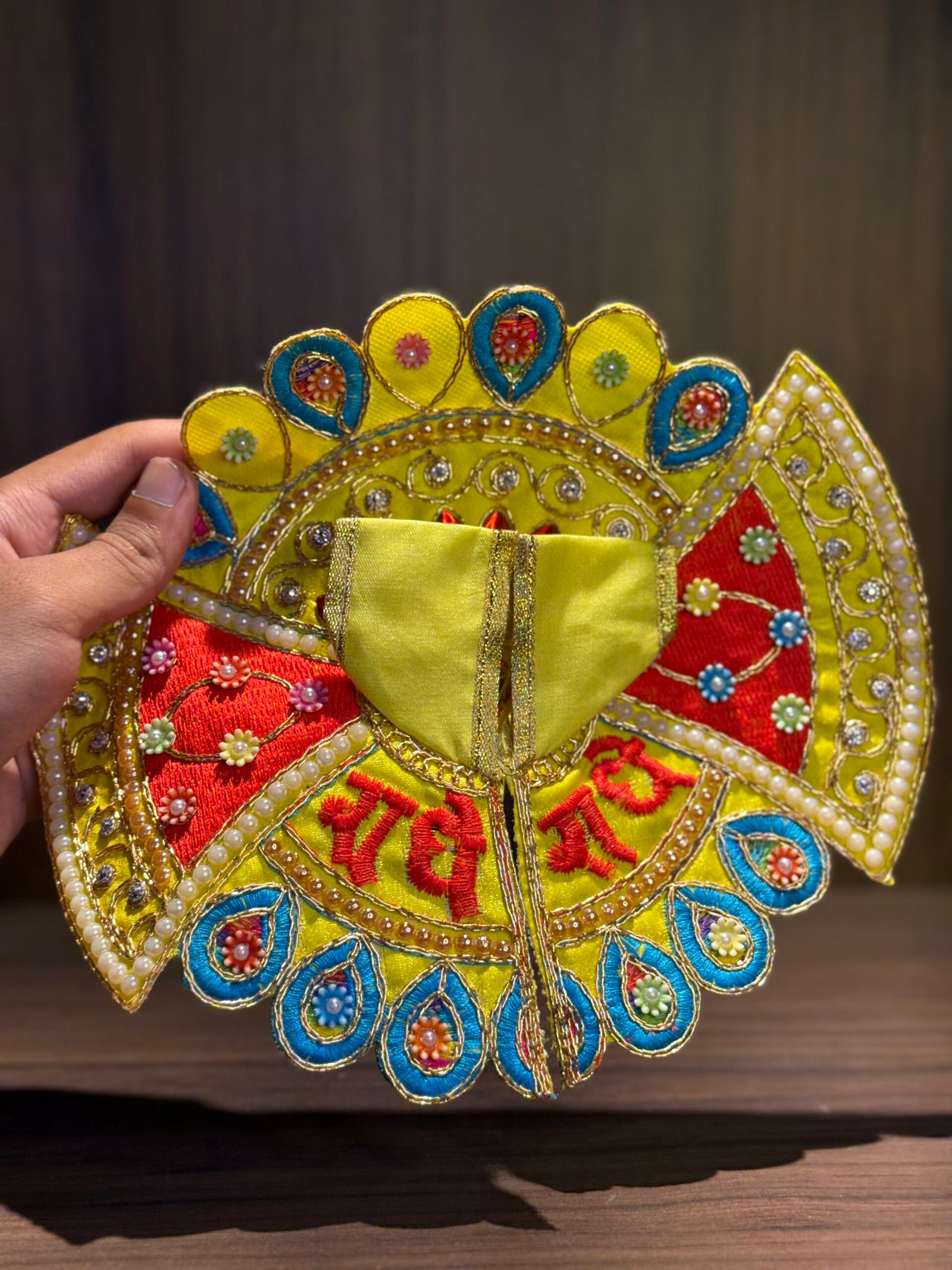 Elegant lavender tones mixed with pink floral borders, topped with “Radhe Radhe” in gold embroidery. A soft and soothing outfit for divine darshan.